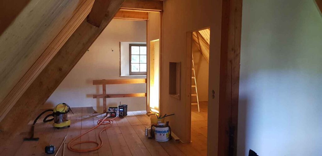 Im Zuge des Umbaus wurde der ehemals offene und kalte Dachraum als Erstes angegangen. Er wurde gedämmt und in separate Räume unterteilt. Im Dachgeschoss befinden sich jetzt ein kleiner Lagerraum für Chalira, eine Abwaschküche für Events und die Müllerstube, die vom Verein zur Schlossmühle verwaltet und vermietet wird.
